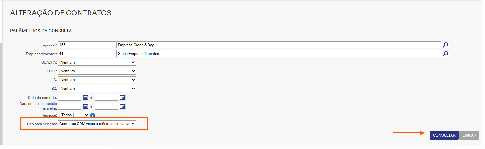Acesse Comercial / Vendas / Contratos / Alteração de Contratos. Selecione a empresa e o empreendimento referentes aos contratos de crédito associativo. Clique em consultar.