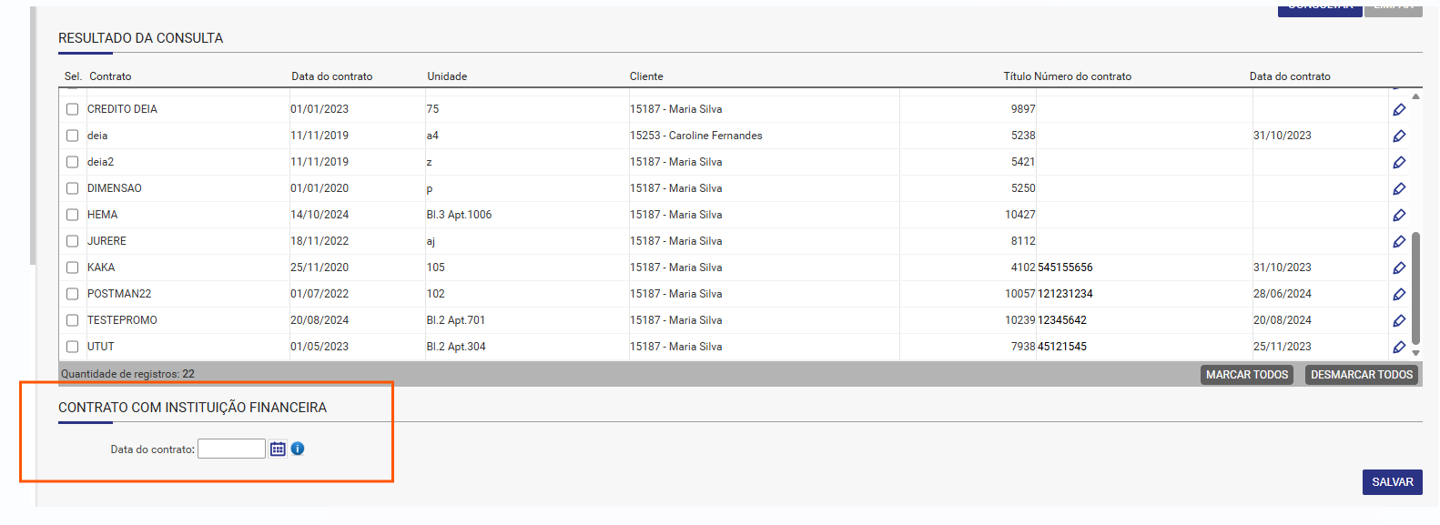 Salve as informações para confirmar que todos os contratos selecionados sejam atualizados com a nova data.