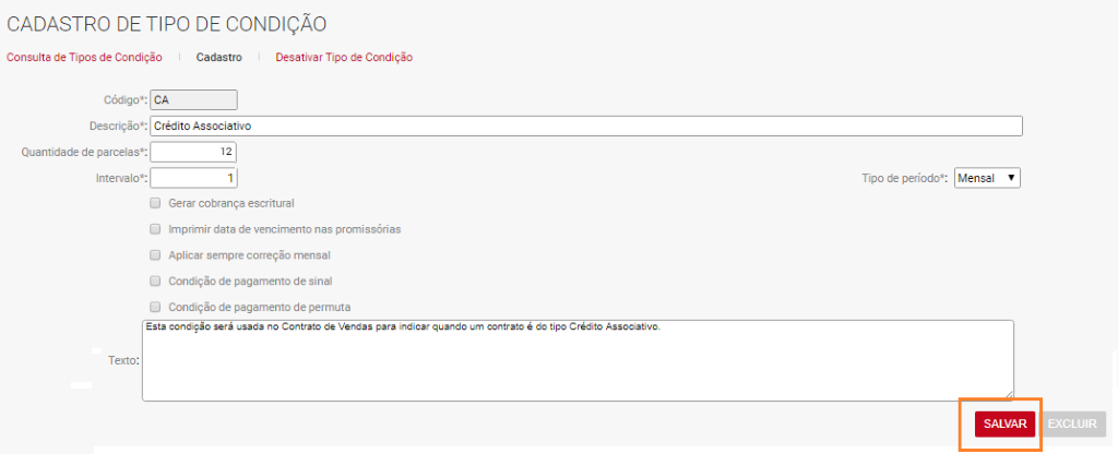- Na descrição do tipo de condição inclua o nome que caracterizará o Crédito Associativo ou Pré-Contrato;