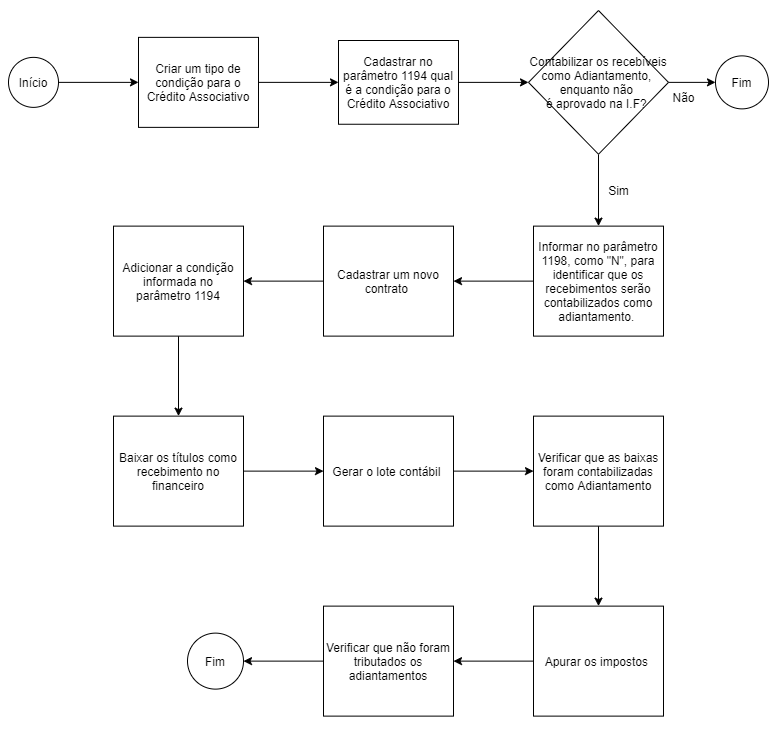 Os recebimentos de todos os contratos do tipo Crédito Associativo serão reconhecidos na Contabilidade como Adiantamento até que ele receba o código do contrato com a I.F..