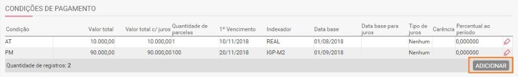 Adicione a condição que foi previamente criada (veja nos pré-requisitos desta seção) referente ao Crédito Associativo através do botão adicionar. Informe o valor total e demais informações e clique em salvar.