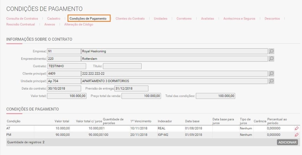 Ao adicionar o tipo de condição Crédito Associativo em um contrato, caso os pré-requisitos tenham sido configurados, todos os seus recebimentos passarão a ser considerados Adiantamento para a Contabilidade.