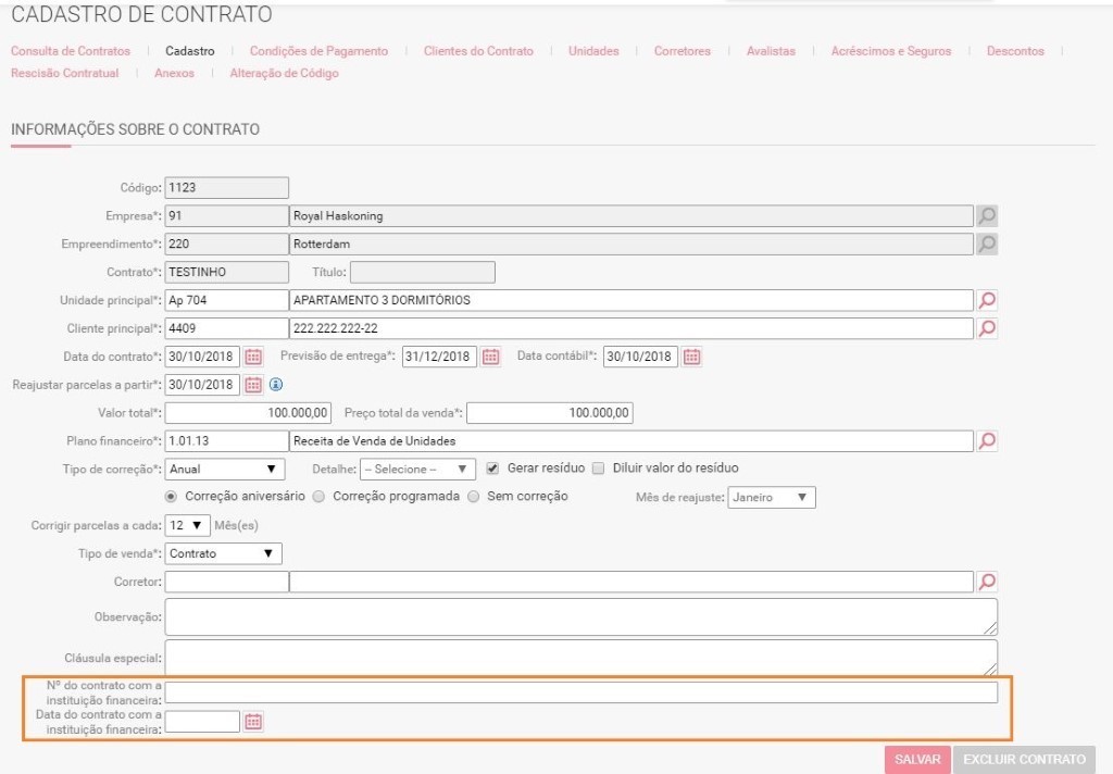 Acesse o cadastro do contrato Comercial / Vendas / Contratos / Contratos e na aba Cadastro insira estas informações nos campos: