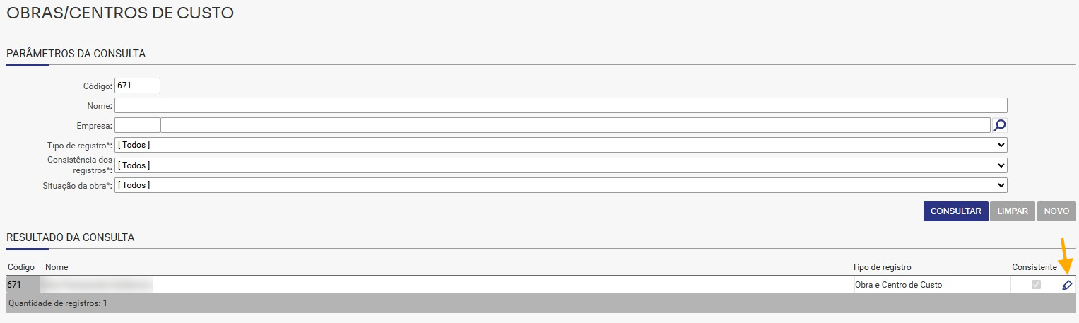 1. Para verificar se a obra está em andamento, acesse Apoio > Obras/Centros de Custo > Cadastros, localize a obra desejada e clique no lápis de edição do registro para acessar o cadastro dessa obra.