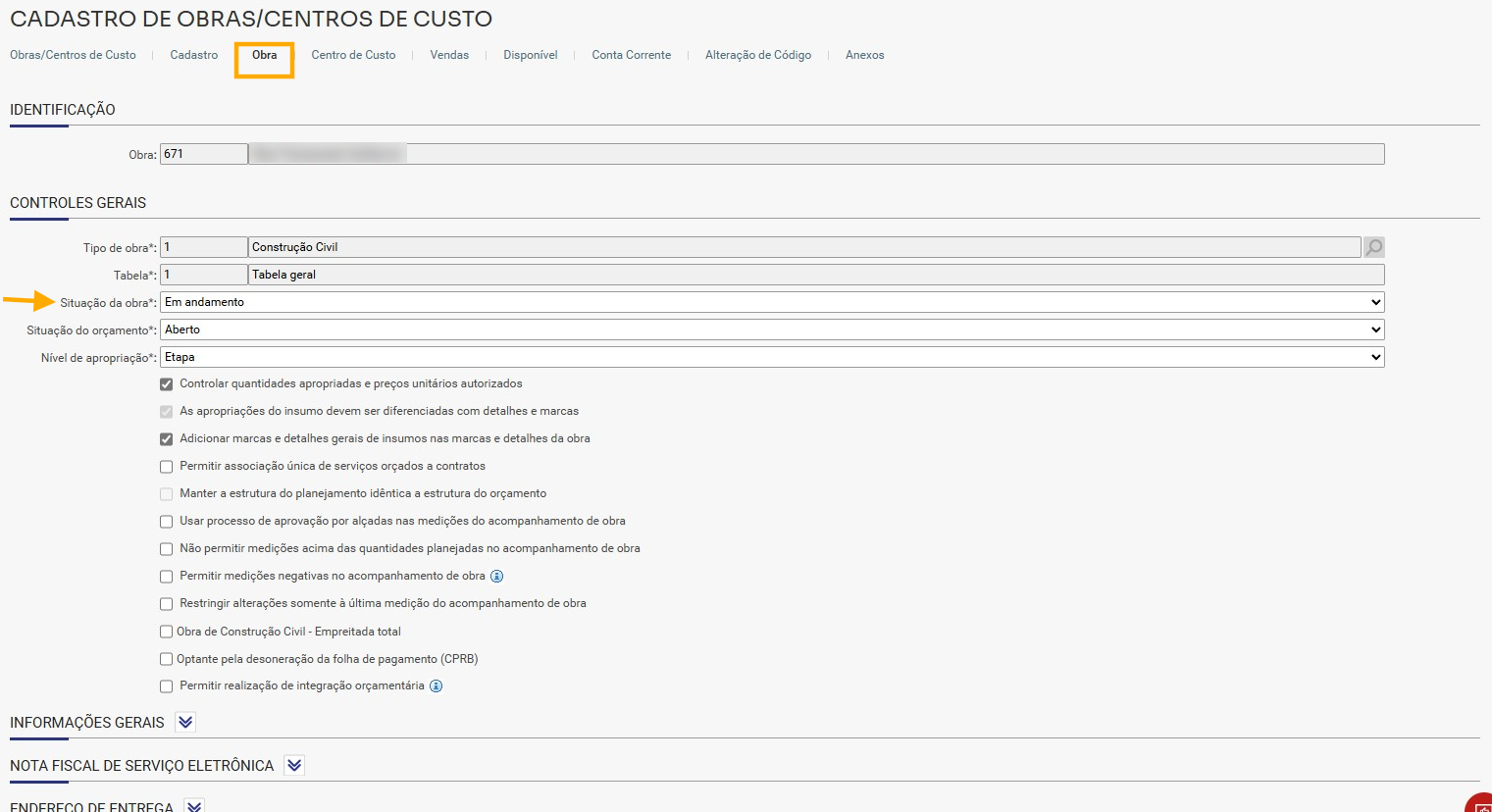 2. Com isso, na aba "Obra" verifique se o campo “Situação da Obra” está com a opção “Em andamento” selecionada.