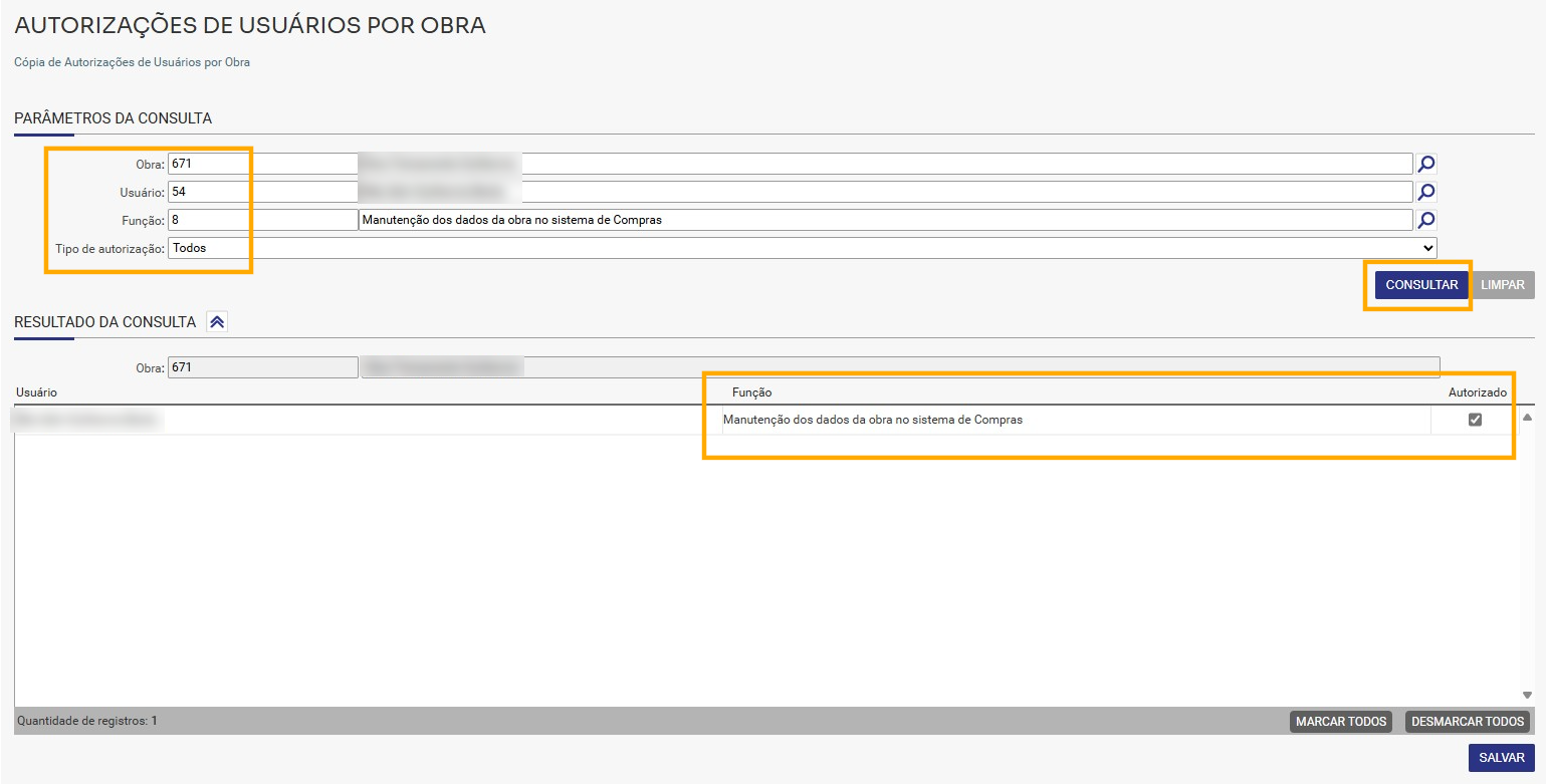 4. Última verificação é a permissão do usuário na obra dentro do sistema de Compras, acesse Segurança > Autorizações > Usuários/Perfis > Obras, filtre pela obra, pelo usuário/perfil desejado e pela Função "8 - Manutenção dos dados da obra no sistema de Compras" e consulte. Somente usuários autorizados nessa função poderão visualizar a obra no sistema de Compras.