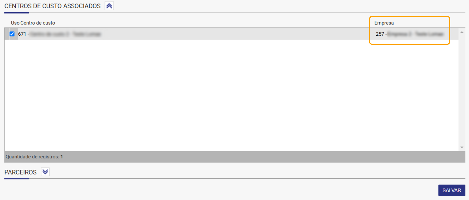 3. Próximo passo é verificar se a empresa da nota fiscal de compra está associada a obra que deseja. Permaneça na aba "Obra", dentro do cadastro da obra, e verifique na seção "Centro de Custo Associados", se há um centro de custo associado a essa obra com a empresa da nota fiscal de compra que está lançando.