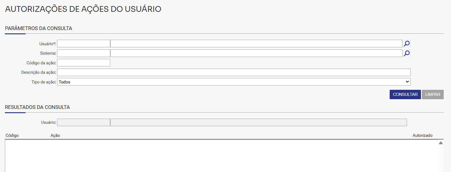 1. No módulo Segurança > Autorizações > Usuários/Perfis > Ações do Usuário/Perfil.