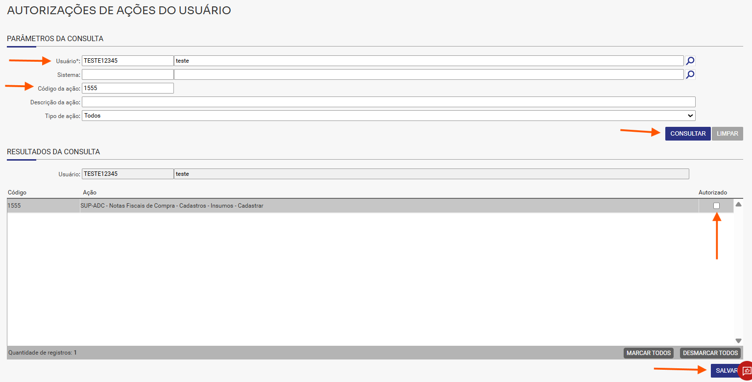 3. Desmarque a coluna de "Autorizado", removendo assim esta ação deste usuário/perfil e clique em Salvar.