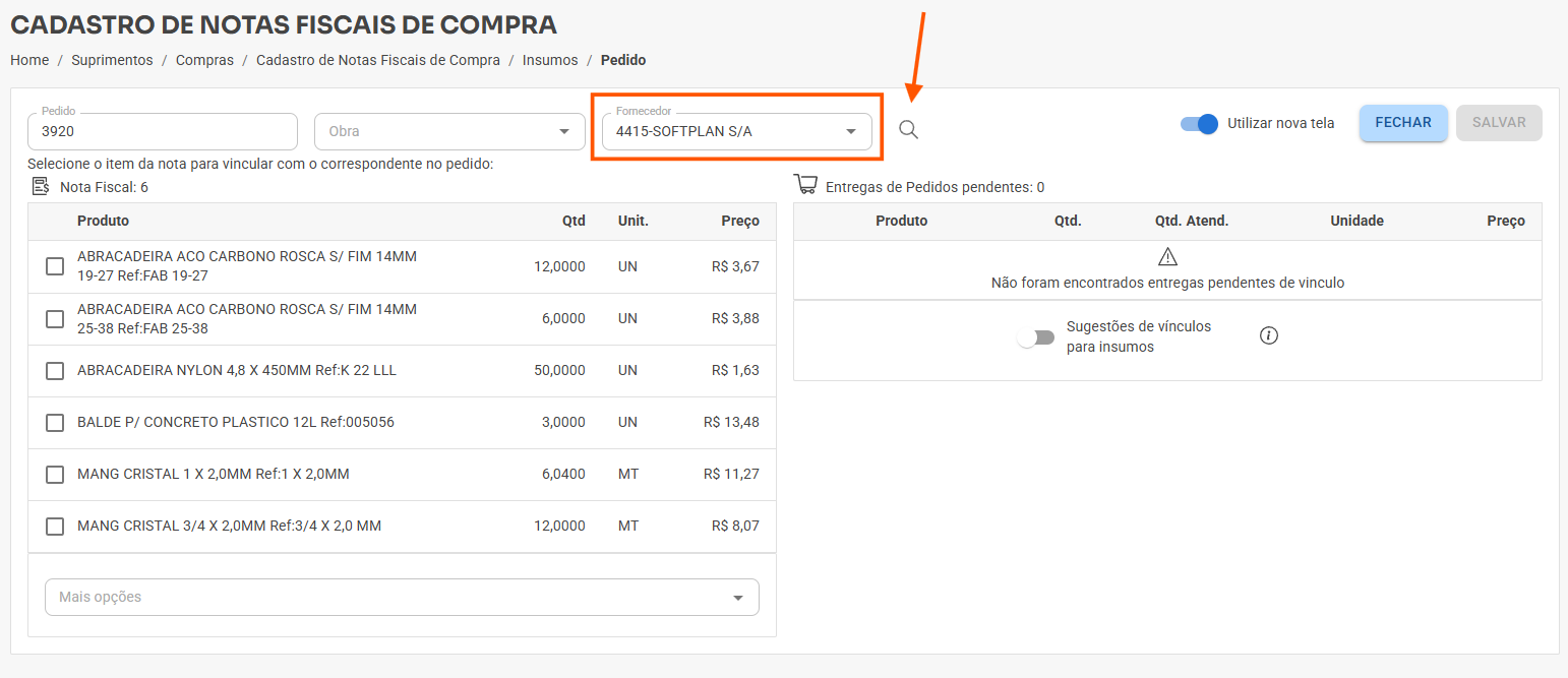 4. Caso a nota esteja sendo lançada com chave de NF-e: Na parte superior da tela informe o fornecedor do Pedido de Compra, podendo informar também o número e a obra, e clique sobre a lupa. O sistema irá apresentar as entregas de pedidos pendentes, conforme os parâmetros selecionados.