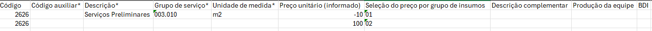Preço unitário (informado): É o preço deste serviço sem a necessidade de incluir uma composição de insumos. Com este preço sempre será necessário informar um grupo de insumo para a alocação de valores, como Mão de Obra ou Material. Deve ser um valor numérico e a data do preço será sempre a data da importação do arquivo.