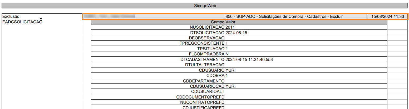 3. Ao emitir o relatório será possível validar o usuário responsável pela exclusão da solicitação de compra, além da data e horário em que foi realizado, conforme exemplo abaixo: