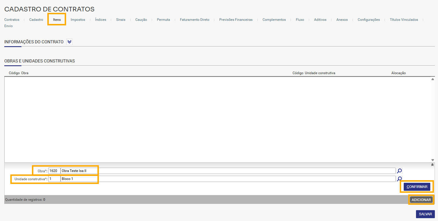 1. Assim que o cadastro do contrato é salvo fica disponível a aba Itens, onde serão feitas a inserções das obras que serão contempladas neste contrato. Somente após a inserção destes itens que será possível conferir o valor total do Contrato.
