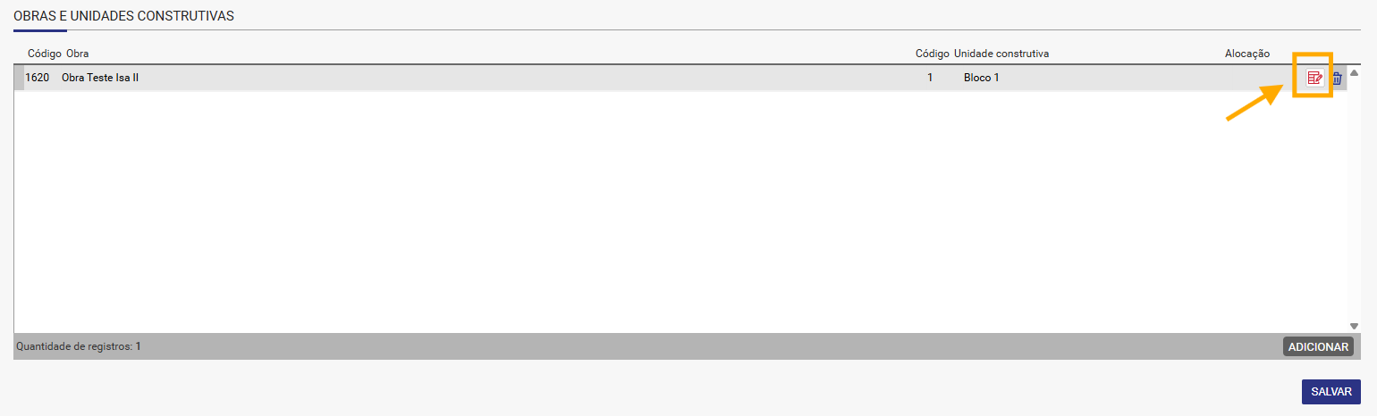 Após salvar a inclusão da obra será possível editá-la clicando no ícone de planilha em vermelho do lado direito na linha da obra para então inserir os serviços/insumos. Esta inserção pode ocorrer de diversas maneiras, dependendo da situação.