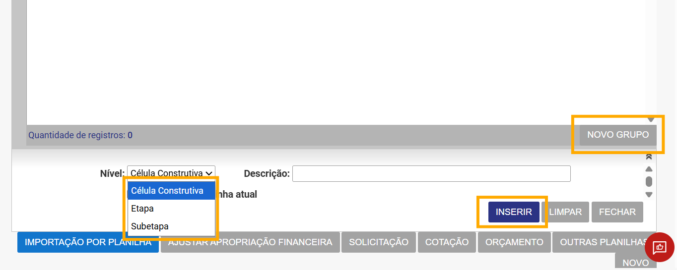 Orçamento: Permite puxar os itens diretamente da estrutura do Orçamento, com as quantidades e preços orçado cadastrados em Engenharia > Orçamento > Planilhas.
