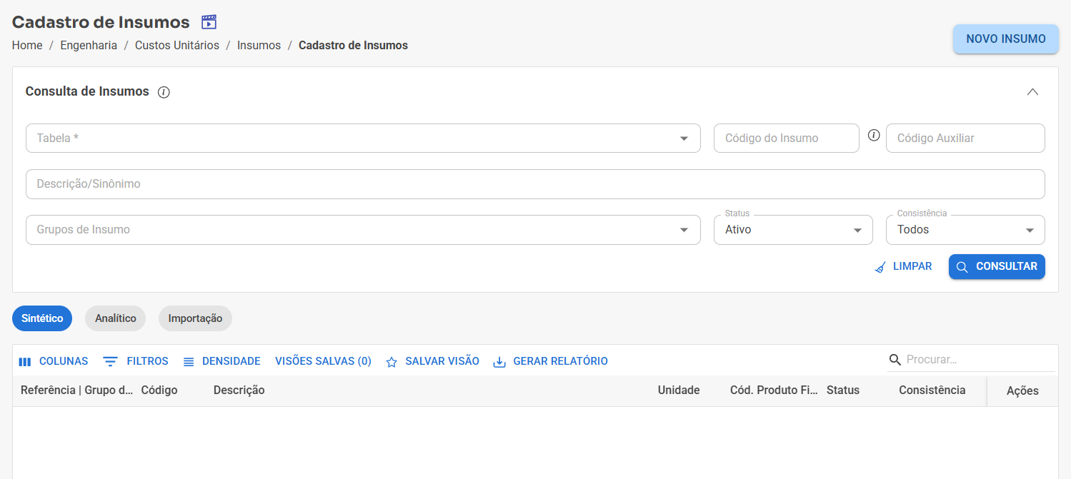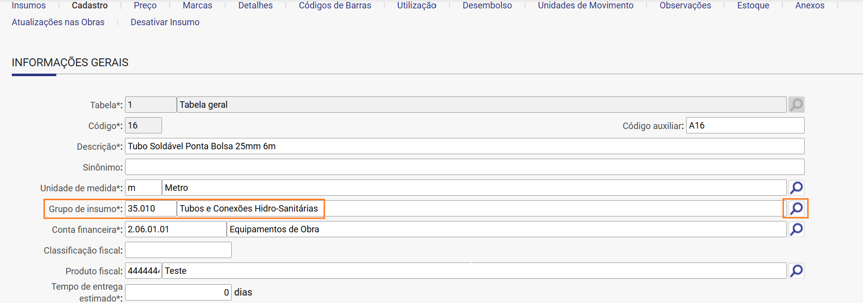 1. A alteração dos grupos de insumos pode ser realizada no cadastro geral do insumo, em Engenharia > Custos Unitários > Insumos > Cadastros: