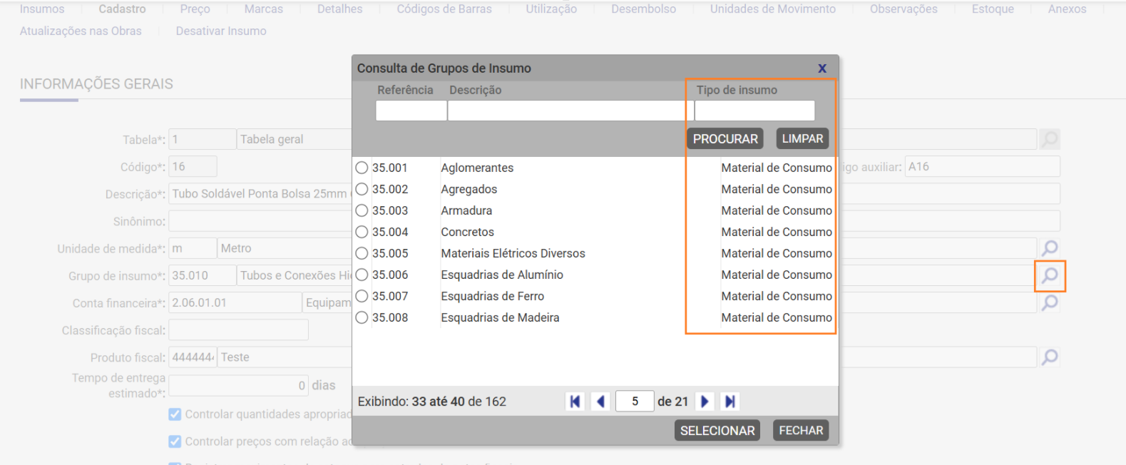 2. Ao editar o insumo, na aba Cadastros é possível validar o Tipo de Insumo. Seguindo a linha do grupo de insumo, ao clicar na lupa a direita podemos validar os grupos disponíveis para alteração e confirmar em qual Tipo de Insumo este insumo está alocado neste momento, como no exemplo abaixo: