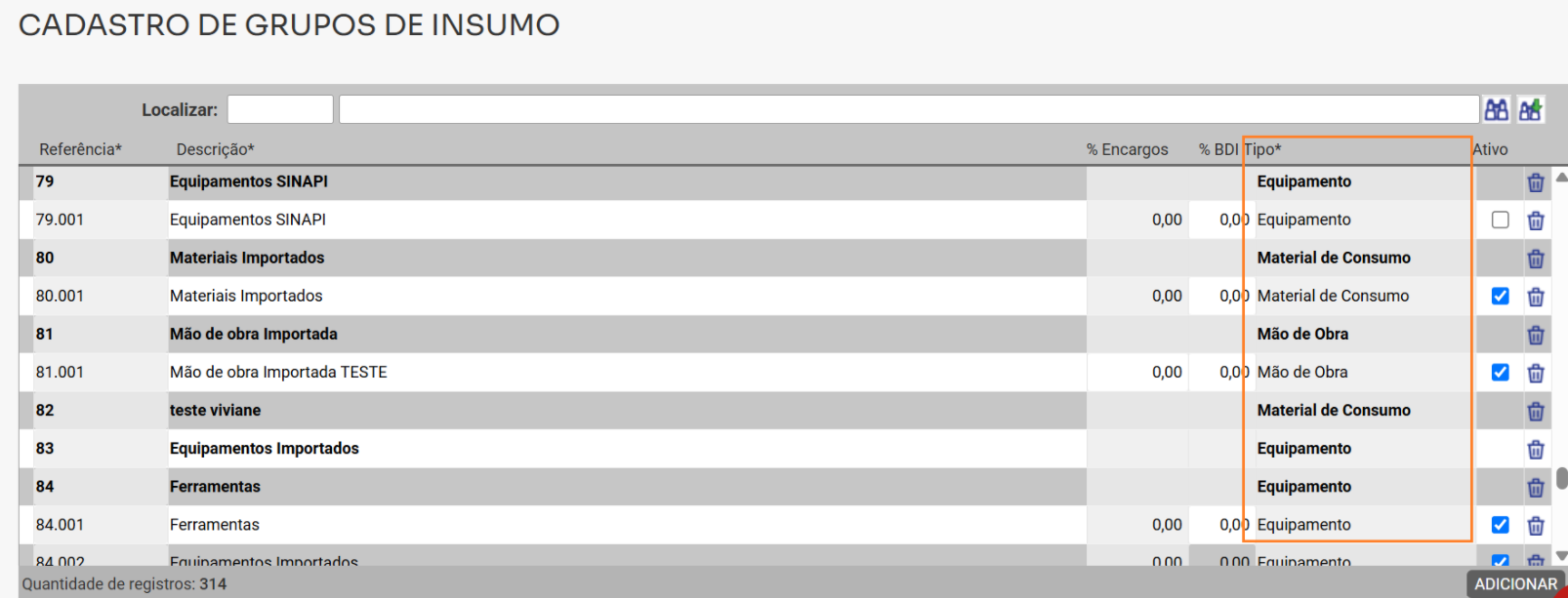 4. Os tipos que foram indicados em cada Grupo de Insumo podem ser validados em Engenharia > Custos Unitários > Insumos > Grupos de Insumo: