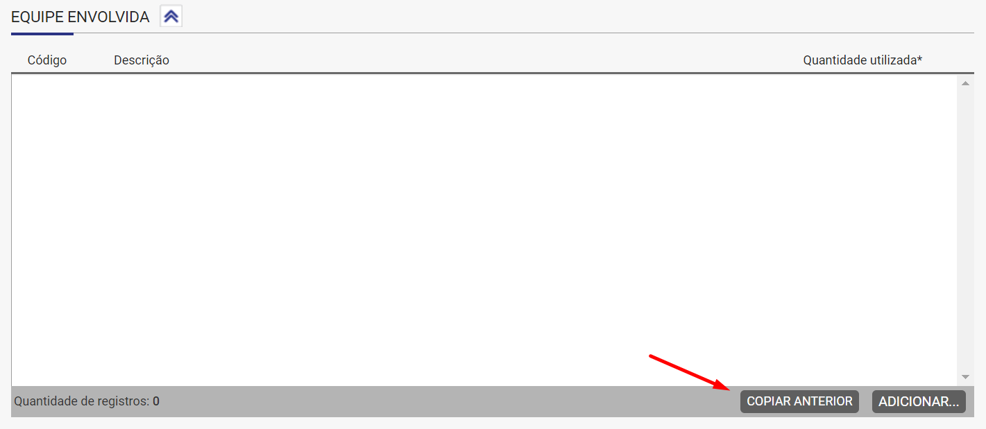 Ao cadastrar ou editar um Registro, na aba de “Equipes e Equipamentos”. Tanto para EQUIPE ENVOLVIDA como EQUIPAMENTOS UTILIZADOS, incluímos o botão COPIAR ANTERIOR. Na aba de “Tarefas”, já tínhamos estes botões. A finalidade dele é que quando o usuário clica neste botão, buscamos os dados já salvos no Registro anterior da mesma obra.