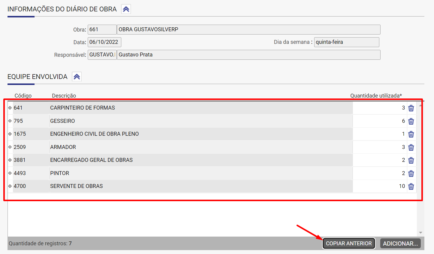 Passo 2: Ao clicar no botão COPIAR ANTERIOR na aba de EQUIPE ENVOLVIDA no registro do dia 06/10/2022, o Sienge busca os registros de EQUIPE ENVOLVIDA do Registro exatamente anterior.