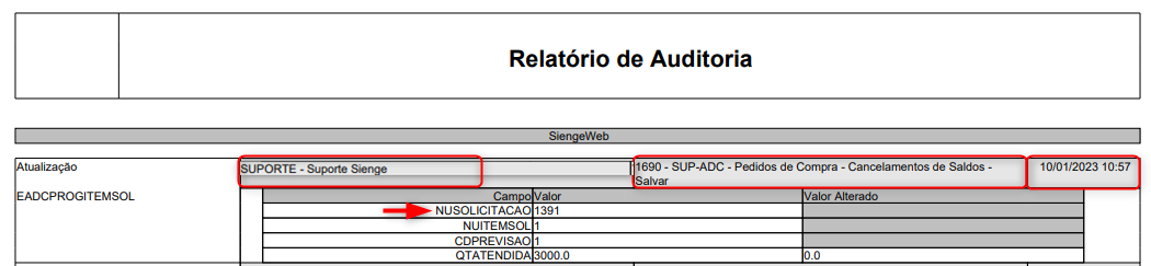 2. Ao emitir o relatório será possível validar o usuário responsável pela alteração, a data e horário desta alteração e a alteração realizada na Solicitação de Compra.