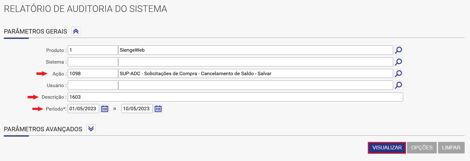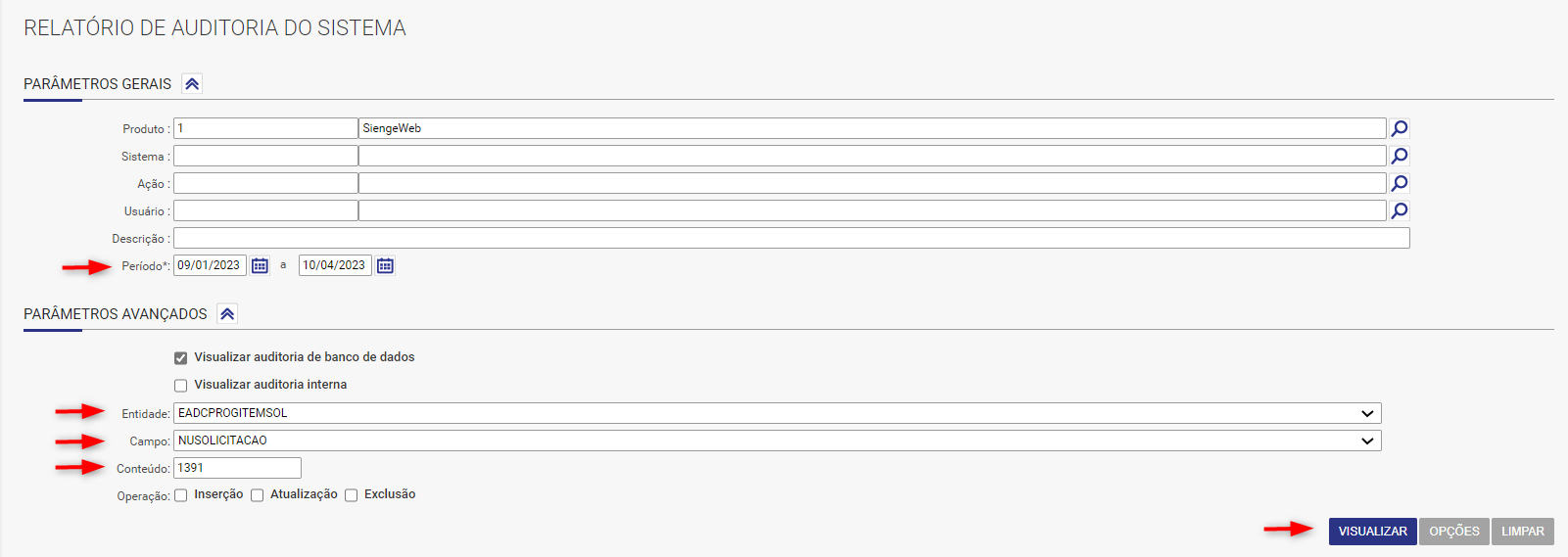 - Período*: Informe a data de início e término de emissão dos dados da auditoria.
