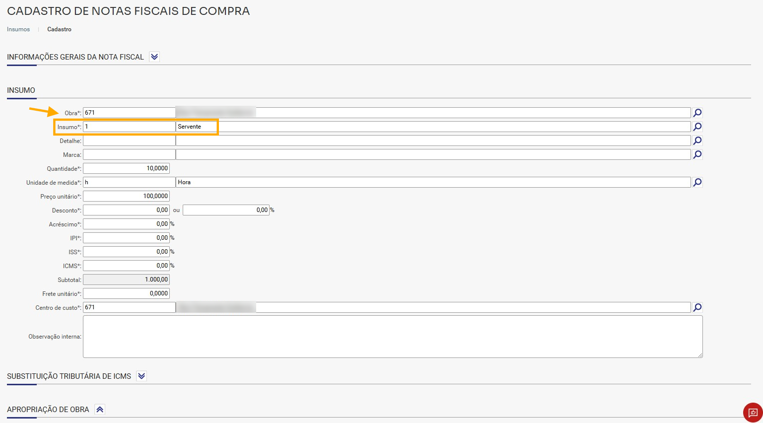 4. Informe a obra na qual os insumos desejados estejam associados e selecione qual insumo será adicionado na nota.