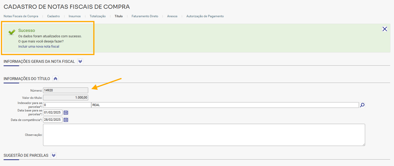 8. Confira a data de competência e ajuste as parcelas de pagamento do título clicando no botão ADICIONAR e informado o valor ou o percentual da parcela. Para gerar o titulo a pagar da nota fiscal, clique em SALVAR no fim da página: