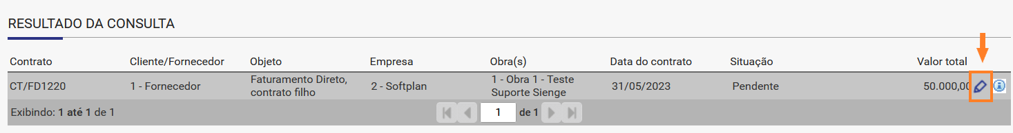 No exemplo, o contrato CT/FD1220 será o nosso contrato de menor valor (Contrato Filho) e nele iremos vincular o Contrato Mãe por Faturamento Direto.