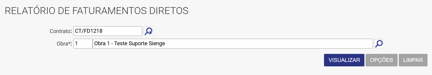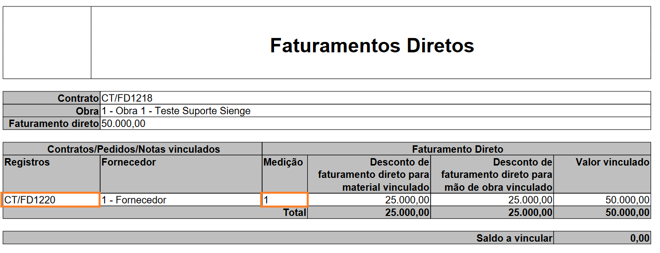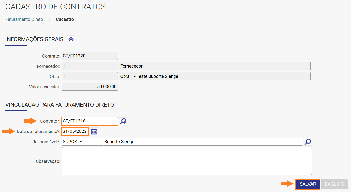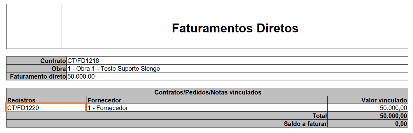 Atenção! Para verificar a presença do vinculo de Faturamento Direto, o usuário poderá utilizar o Relatório Faturamento Direto no menu Suprimentos > Contratos e Medições > Relatórios > Contratos.