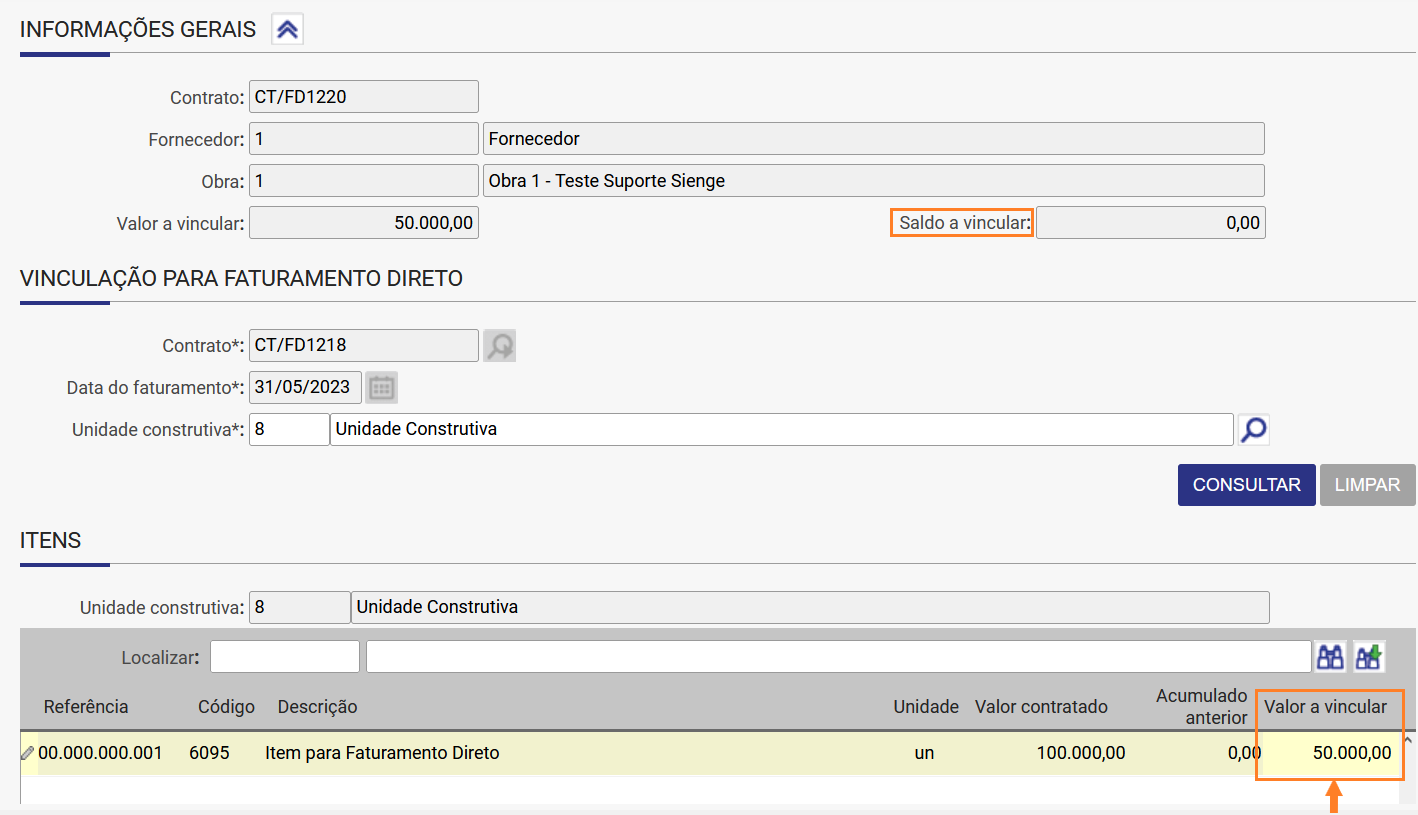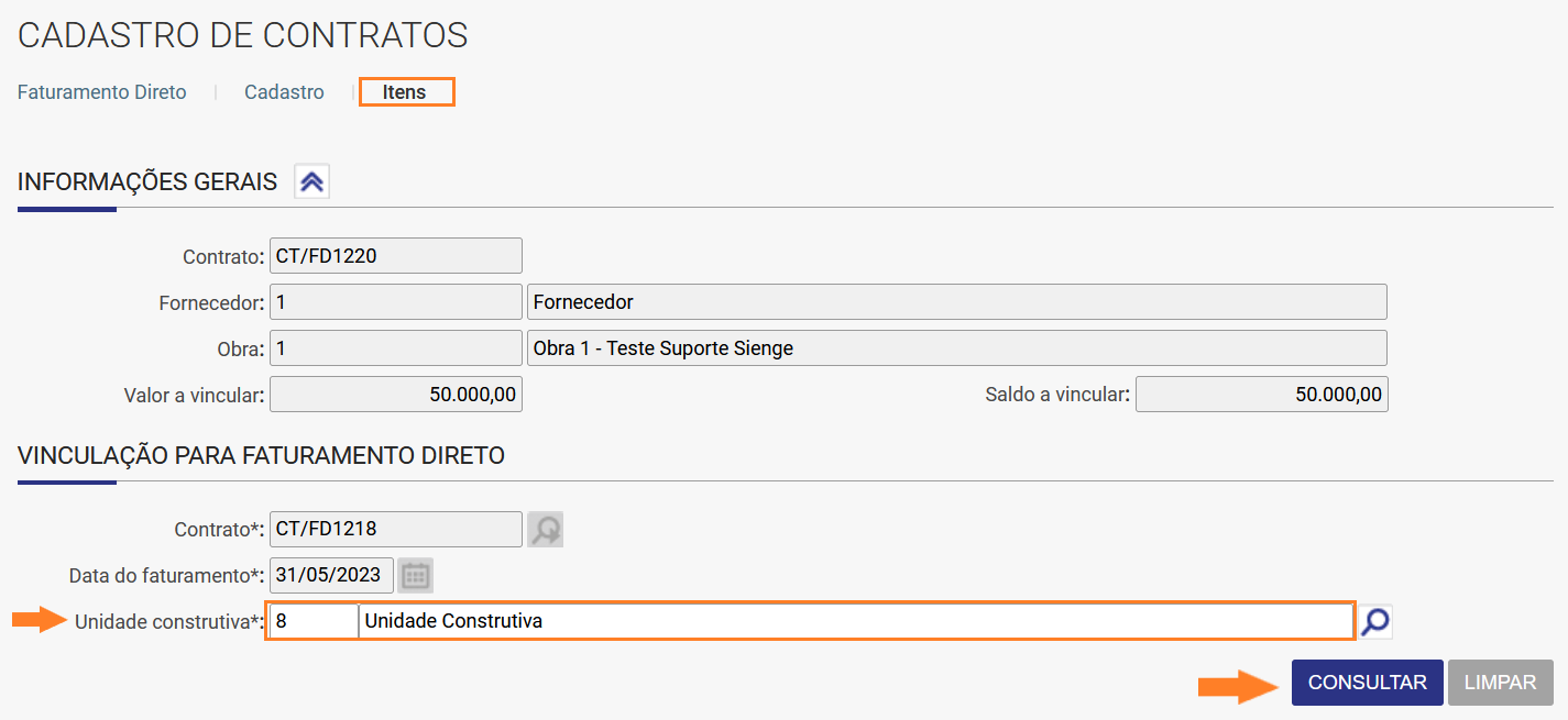 Acesse a aba ITENS, dentro do Vinculo de Faturamento Direto, e consulte a Unidade Construtiva.