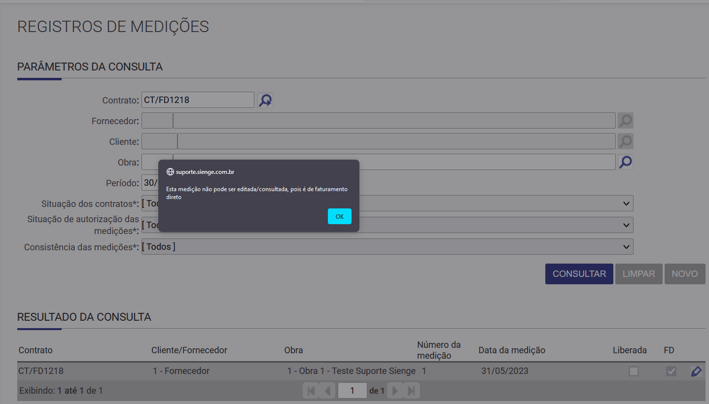 Concluindo este vinculo, o Sienge irá cadastrar automaticamente uma medição para o Contrato Mãe referente ao desconto de Faturamento Direto, em Suprimentos > Contratos e Medições > Medições > Cadastros. Nesta modalidade, a medição não é acessada e o sistema informa: Esta medição não pode ser editada/consultada, pois é de faturamento direto.