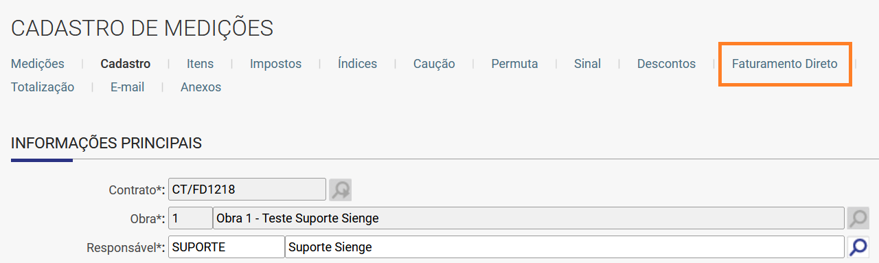 Após cadastrar a medição para o CONTRATO MÃE e informar o valor medido na aba ITENS, acesse a aba Faturamento Direto no cadastro da medição.