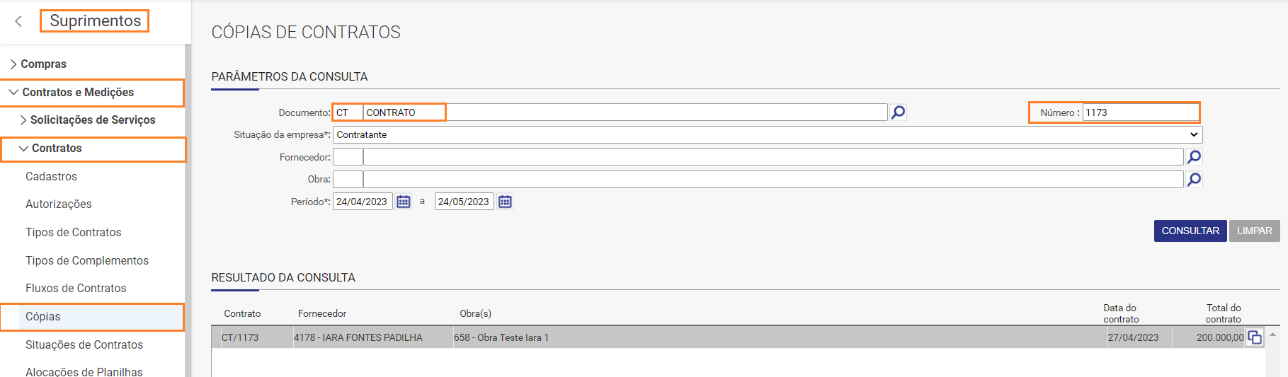 1. Acesse o menu Suprimentos > Contratos e Medições > Contratos > Cópias e consulte o contrato desejado, informando documento e número de contrato em seus respectivos campos.
