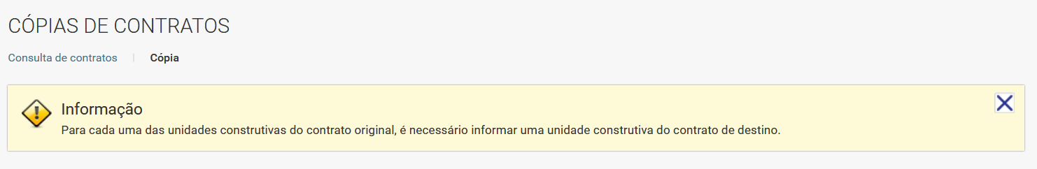 Atenção! Quando a obra é alterada no contrato destino, o sistema pede que o usuário informe uma Unidade Construtiva para esta nova obra informando a mensagem: Para cada uma das unidades construtivas do contrato original, é necessário informar uma unidade construtiva do contrato de destino.