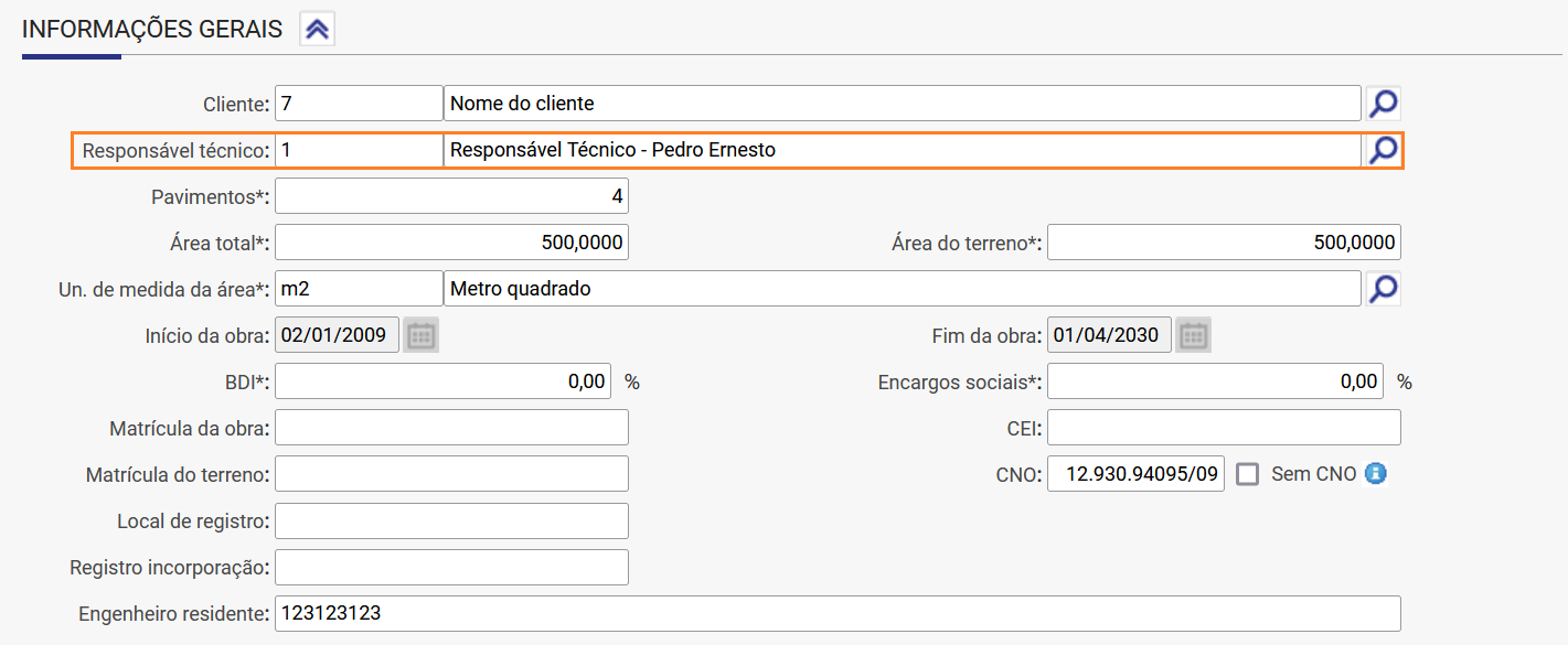 3. Para vincular o Responsável Técnico na obra acesse o menu Apoio > Obras/Centros de Custo > Cadastros. Consulte e edite a Obra desejada. Na aba Obra, associe o Responsável Técnico no campo Informações gerais.