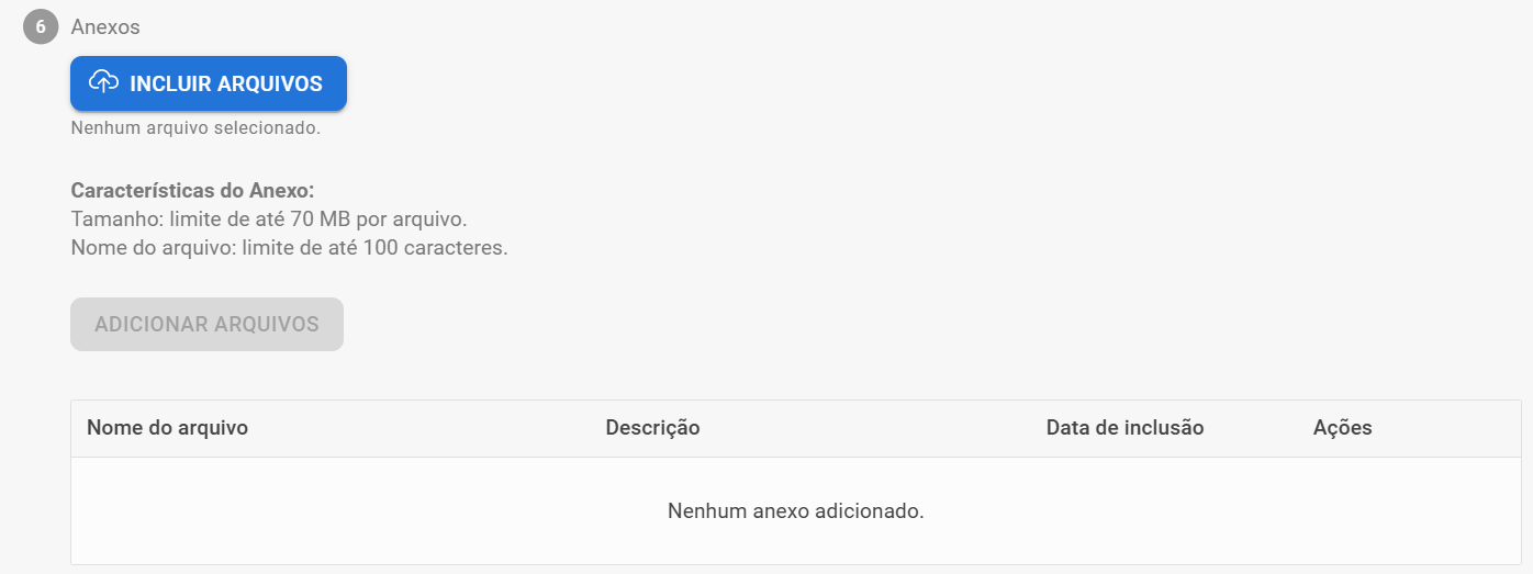 - Adicionar arquivos: Selecione para confirmar a inclusão dos arquivos selecionados. Será possível inclusão de arquivos com até 70mb de tamanho, e com a descrição até 100 caracteres. Os anexos que não cumprirem estas regras serão sinalizados em vermelho na tela, impedindo a adição deles.