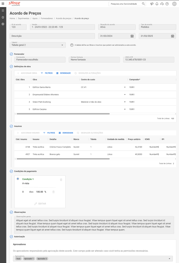 Atenção! A tabela define a Obra e Insumos que podem ser adicionados ao acordo de preços. Ao salvar os dados iniciais, o sistema irá bloquear a sua alteração.