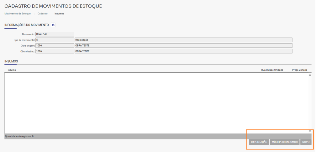 - Botão importação: Permite importar uma planilha com todos os insumos que serão inseridos neste movimento.