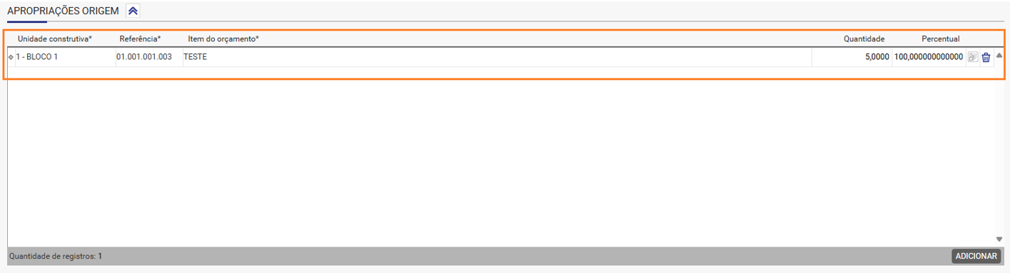 Atenção! Nesse campo devem ser inseridos todos os insumos movimentados. Ao inserir o insumo desejado, preencher as informações necessárias e, ao salvar a tela ele será realocado instantaneamente para apropriação destino.