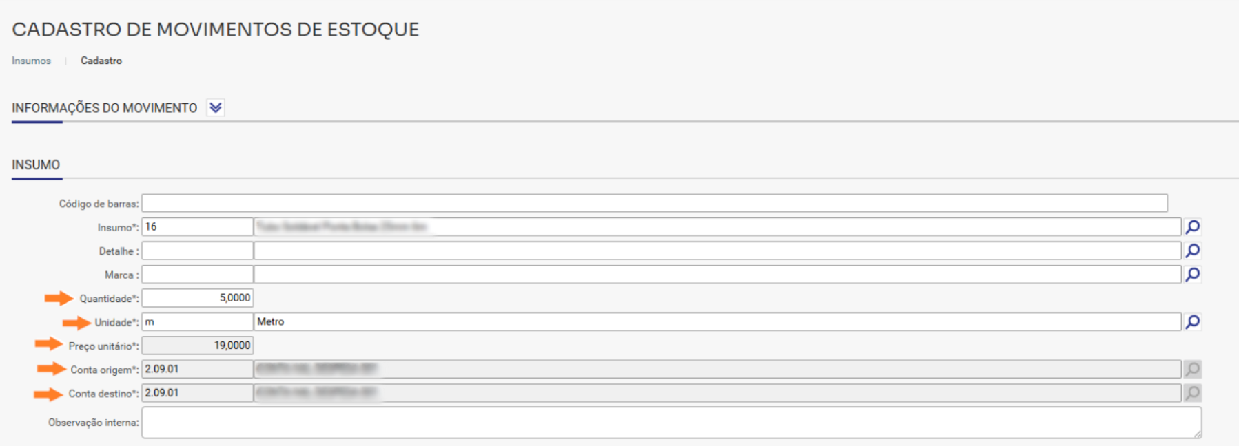 - Conta destino: Campo para preenchimento da conta financeira destino para o movimento desse insumo e da mesma forma que a conta financeira de origem, será preenchido por padrão com a conta já definida no cadastro do insumo;