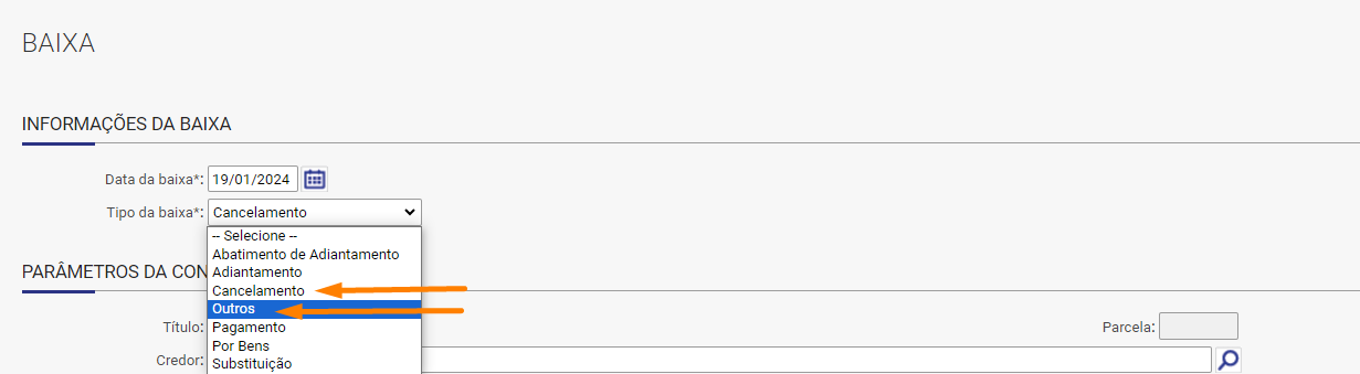 A 1° opção é realizar uma baixa nula, pois, na realidade, não ocorrerá o pagamento dessas guias. Para fazer isso, acesse: Financeiro / Contas a Pagar / Baixas / Inclusão.
