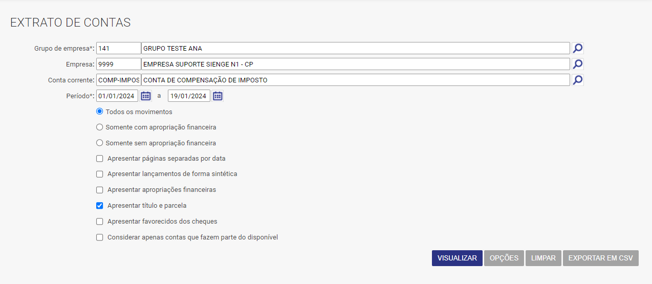 Acesse em Financeiro / Caixa e Bancos / Relatórios / Extrato de Contas: