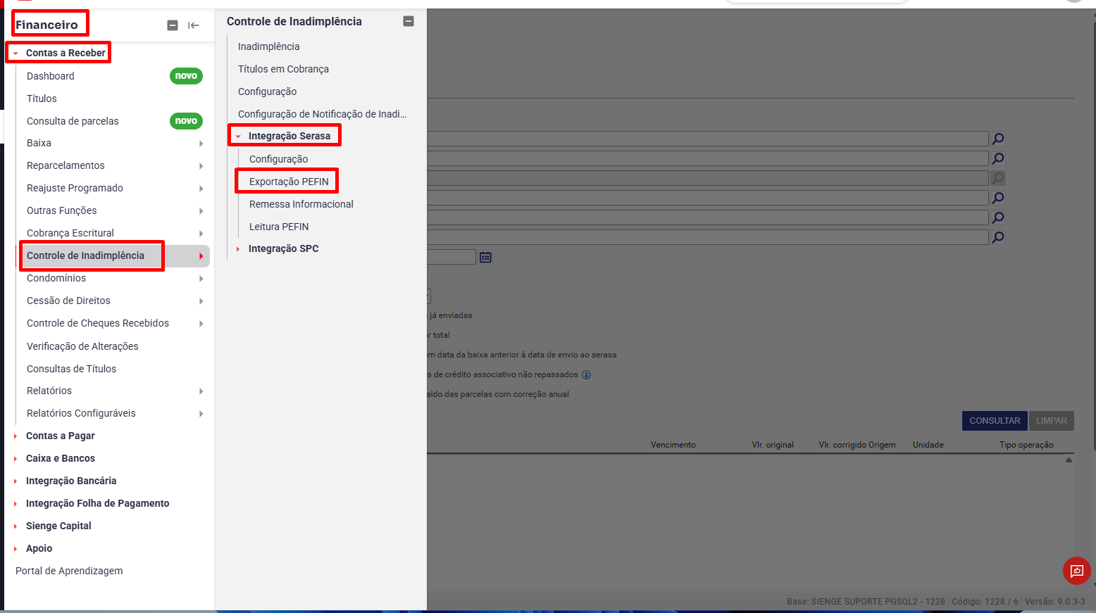 Acessar Financeiro / Contas a Receber / Controle de Inadimplência / Integração Serasa /  Exportação PEFIN