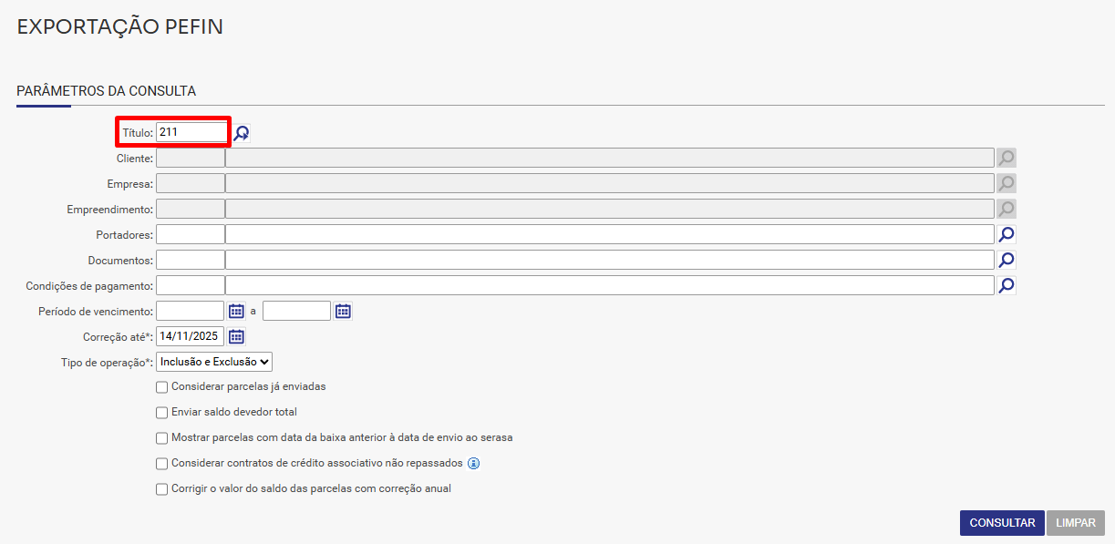 Atenção! Caso a parcela que irá enviar ao Serasa, seja de um contrato com correção monetária anual, precisa se atentar ao preenchimento do campo "correção até" e a flag "Corrigir o valor do saldo das parcelas com correção anual". Se deseja que a parcela vá para o Serasa com o valor original, é preciso deixar a flag desmarcada, já se desejar enviar com a correção atualizada deve deixar a flag marcada para o sistema puxar o valor da parcela corrigido até no mês que está enviando o arquivo de exportação PEFIN ao Serasa.