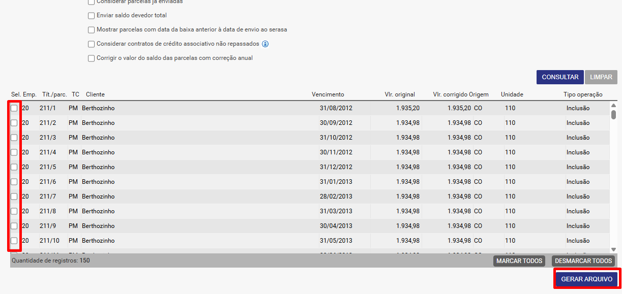 2) Selecionar as parcelas desejadas  e gerar o arquivo.
