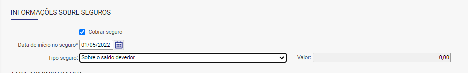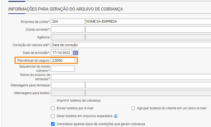 2.1. Se o parâmetro estiver como Saldo devedor atual, ao gerar o boleto, no campo "Percentual do seguro" será informado um percentual, este será calculado sobre o saldo devedor atual do título.