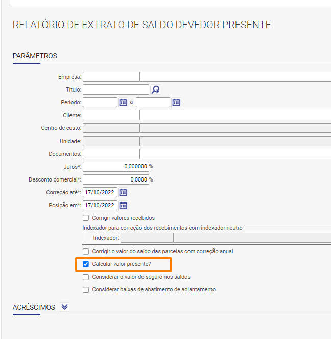 Ao emitir por exemplo o RELATÓRIO DE EXTRATO DE SALDO DEVEDOR PRESENTE deverá marcar a flag " Calcular valor presente" para obter este valor e assim, realizar o seguinte cálculo: