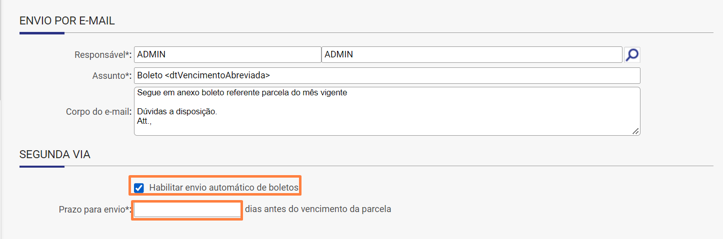 1.2) Marcar a flag "Habilitar envio automático de boletos" e informar quantos dias antes do vencimento do boleto deseja que seja enviado o email.