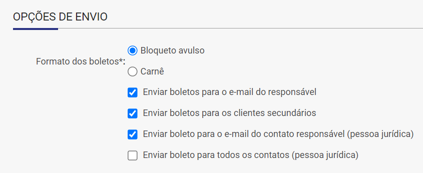 Dica! Caso deseje enviar a segunda via do boleto para os clientes secundários você pode marcar as flags abaixo:
